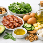 | Lanche da Tarde | Punhado de azeitonas e queijo feta. | Frutas frescas (ex: uvas). | Palitos de pepino com iogurte temperado. | Torrada integral com pasta de amame. | Mix de sementes. | Frutas e um pedaço de queijo. | Iogurte com frutas. |